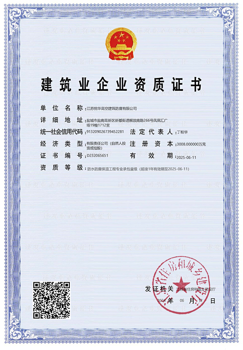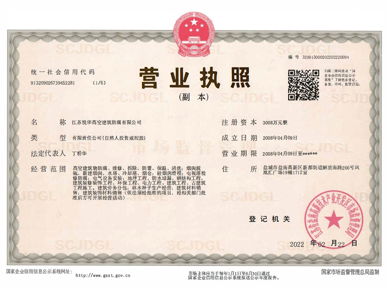 江蘇悅華高空建筑防腐有限公司是高空建筑維修、安裝、防腐保溫、防水堵漏等專業作業資質企業。具有高空建筑、安裝、防維修、清洗堵漏等綜合作業能力,具有獨立的高空新建、維修、防腐、脫硫、堵漏等專項承攬施工能力的法人企業。具有建設部門頒發的防腐保溫、高空作業等工程專業資質,現已發展成為領導班子過硬、技術力量雄厚、施工單位、管理規模比較大的現代化企業,是一個集科研、開發、設計、施工為一體的大型綜合性集團公司。